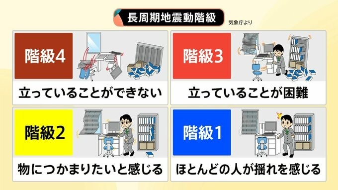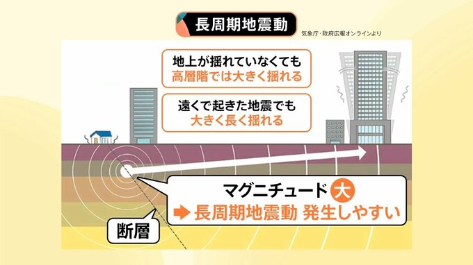 今回の地震でよく言われているのが「長周期地震動」です。東日本大震災のときにも大きくクローズアップされましたが、揺れの周期が長く、遠くまで揺れが伝わるといわれています。マグニチュードが大きい地震ほど、長周期地震動が発生しやすくなります。