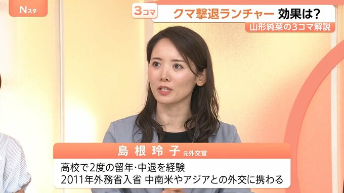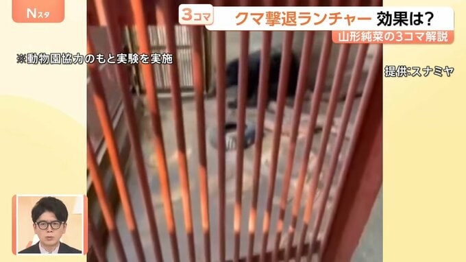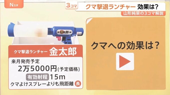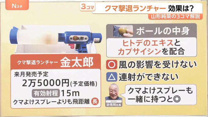 メリットとしては、風の影響を受けない。一方で、連射ができないということで、開発したスナミヤの砂見明社長は「クマよけスプレーと一緒に持つとさらに効果が上がるのではないか」と話していました。
