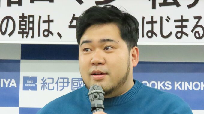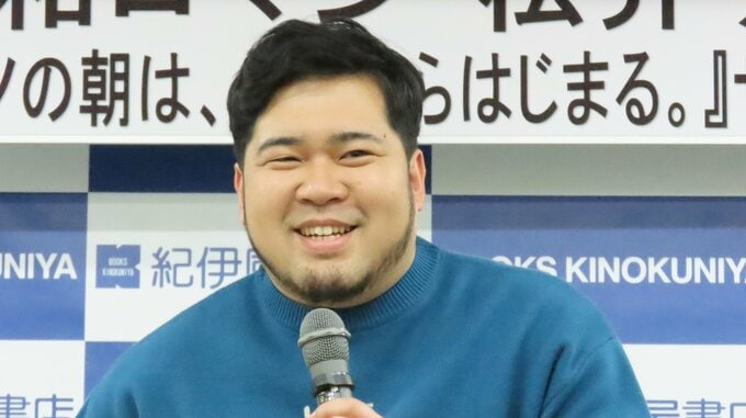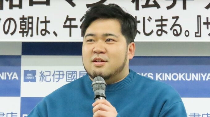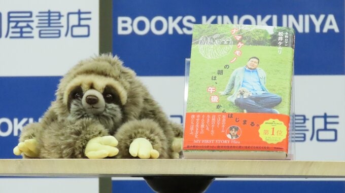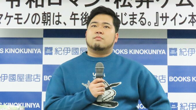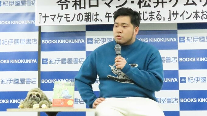 お笑いコンビ・令和ロマンの松井ケムリさんが、自身初の単著『ナマケモノの朝は、午後からはじまる。』発売記念サイン本お渡し会を開催。イベント前に、取材会に登場しました。