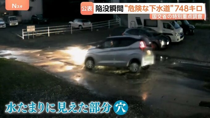 同じ山陰地方の島根県。2025年8月、水たまりを走っていた軽乗用車が突然、動けなくなります。実は、水たまりに見えた部分に穴が開いていたということです。
