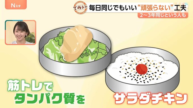 「筋肉弁当。(作る)時間は5分ぐらいです。包丁も使わず、短時間で出来るお弁当にしています」