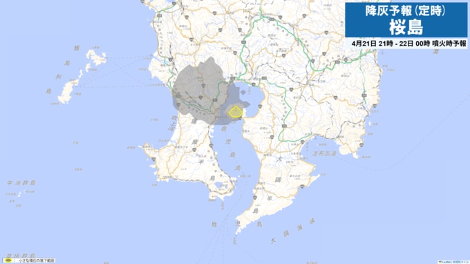 21日21時から22日15時までに噴火が発生した場合には、以下の方向・距離に降灰及び小さな噴石の落下が予想されます。