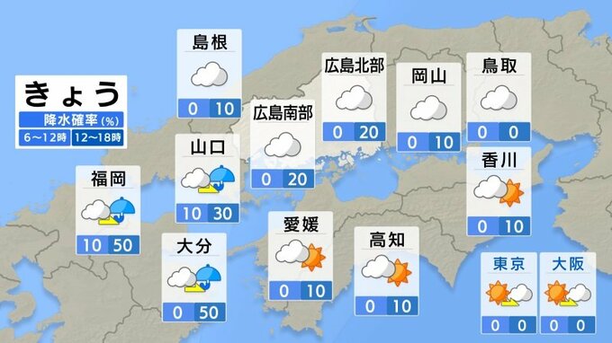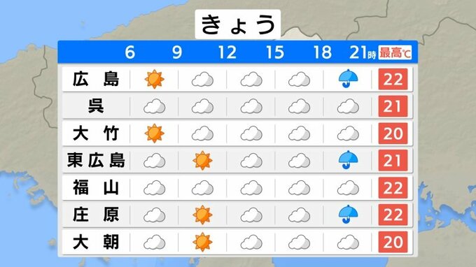 きょう22日(水)の広島県の朝は、雲が広がっています。冷え込みは平年並みのところが多く、最低気温は広島12.3℃、福山9.0℃、三次4.8℃でした。
