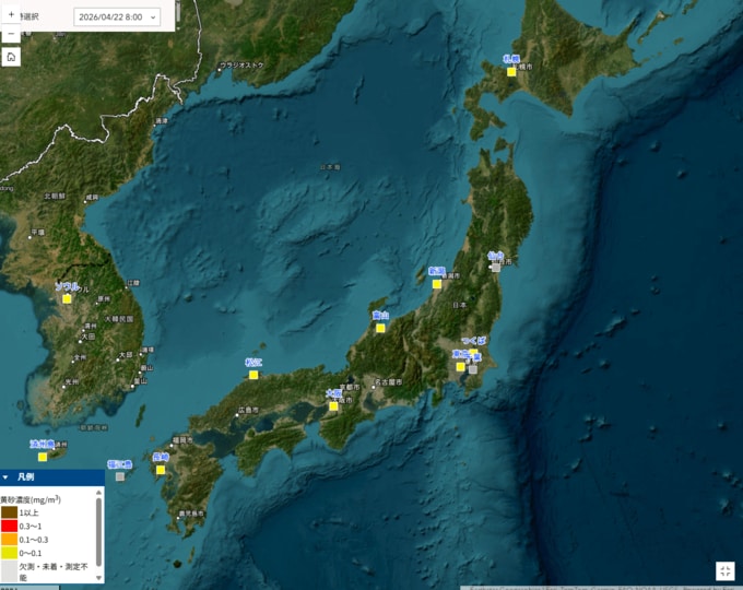 国立環境研究所の観測によると、22日も東京、大阪、札幌、つくば、新潟、富山、松江、長崎と、日本列島の広い範囲で黄砂の飛来が確認されています。