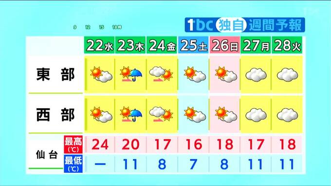 【22日宮城の天気】各地で晴れて気温上昇・最高気温仙台で24℃予想 強風と乾燥に注意必要 tbc気象台 東北放送 2026年4月22日(水) 11:17 国内 天気 週間予報:23日夜は南部で雨のおそれ 今週の天気は、基本的に晴れや曇りの日が多い見込みです。ただし、明日(23日)は夜遅くを中心に、特に南部ほど雨が降りやすくなりそうです。気温は平年並みの日が多いでしょう。