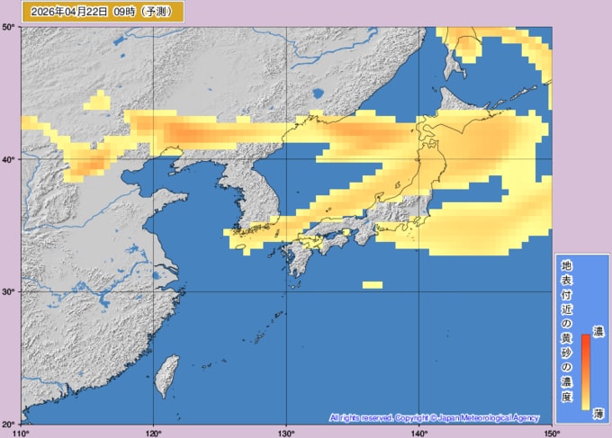 22日も、太平洋側を中心に黄砂が予想されていて、洗濯物や車などに黄砂が付着するおそれがあり、注意が必要です。