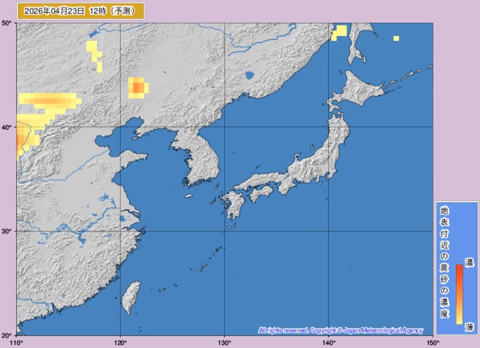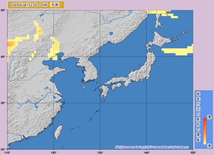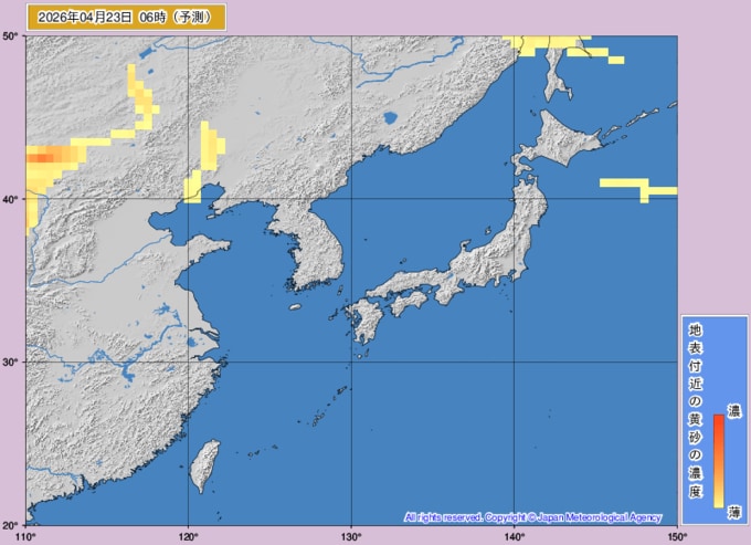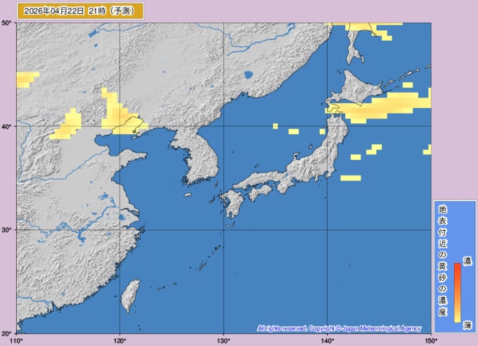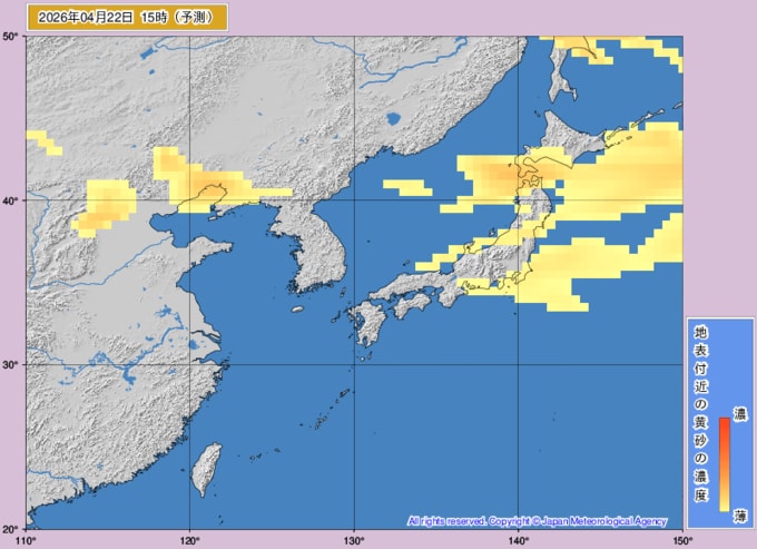 【黄砂情報】22日(火)も日本列島に「黄砂」飛来…いつどこに飛んでくる?気象庁の黄砂解析予測図【25日(土)にかけての黄砂飛来シミュレーション】