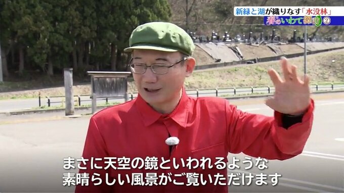 「向こうの方をご覧ください。(湖に木が生えているような・・・) この時期だけにしか見れない景色でして、他の場所ではなかなか見れない素晴らしい景色じゃないかと自負している」