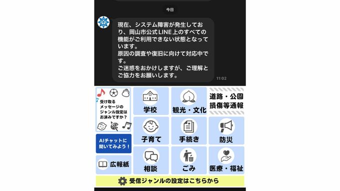 岡山市公式LINEのすべての機能が利用できない状態(22日午前11時25分現在) RSK山陽放送 2026年4月22日(水) 11:25 国内 きょう(22日)岡山市役所の公式LINEのすべての機能が利用できない状態になっています。 岡山市は、午前11時25分現在、原因の調査や復旧に向けて対応中だということです。