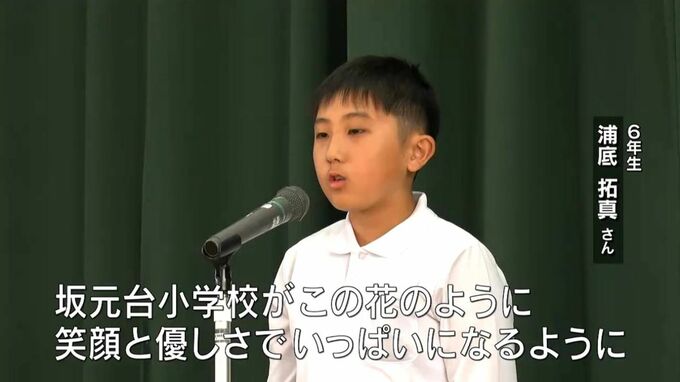 「坂元台小学校が、この花のように笑顔と優しさでいっぱいになるように、みんなで大切に育てていきます」