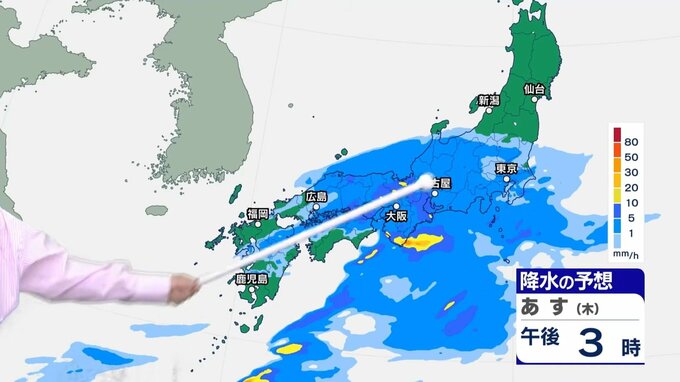 あすは低気圧が日本の南岸を東へ進む見込みです。半日で1000キロくらい東へ移動するので、あさ、九州付近にある低気圧は夜には関東まで進むでしょう。広範囲で雨になり、強く降る所もありそうです。雨の降り出す時間帯は、近畿ではあす明け方、東海はあす昼前、関東はあす昼過ぎになりそうです。夜は関東で雨のピークになり、ザーザー降りの雨になりそうです。沿岸部では風も強く、傘をさしても濡れるような降り方をしそうですので、ご注意ください。