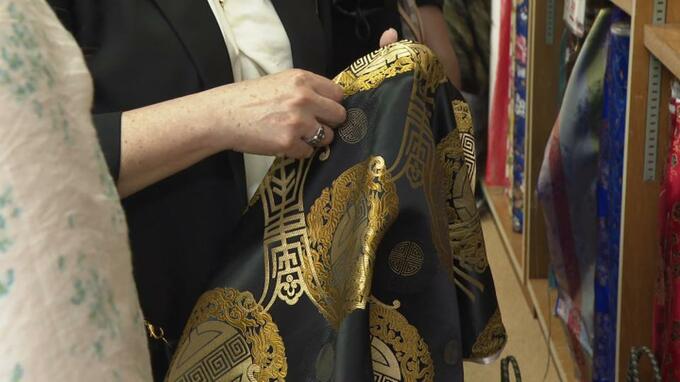 衣装のアイデアを探ろうと、県内の老舗生地店でイメージを膨らませる押元さん。生地を見ながら…