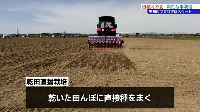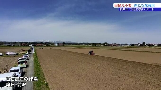 22日は奥州市前沢にある白石農産の田んぼで、県の関係者や農家など8人が集まり種まきを行いました。