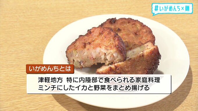 『いがめんち』とは、津軽地方、特に内陸部の弘前で昔から食べられてきた家庭料理。イカを包丁でたたき、玉ねぎやにんじんなどの野菜と一緒にまとめ、揚げたり焼いたりして作ります。