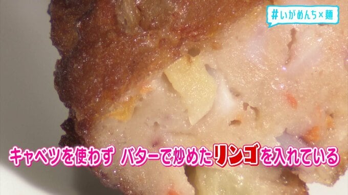 しかしこの『いがめんち』、一般的なレシピとはひと味違います。多くの家庭ではキャベツを使うところ、ここではバターで炒めたりんごを使っているのです。