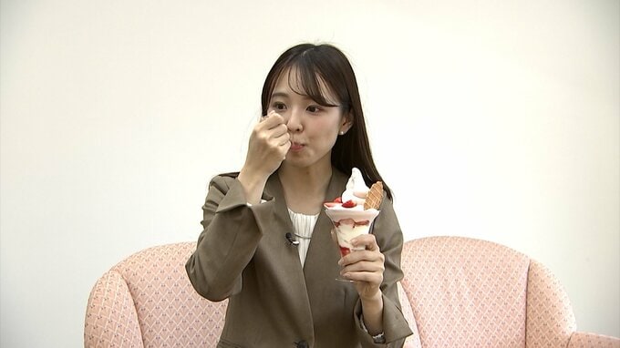 「いただきます。美味しいです。このソフトクリームのいちごの甘さと、いちご自体の酸味がとてもよくあっています」