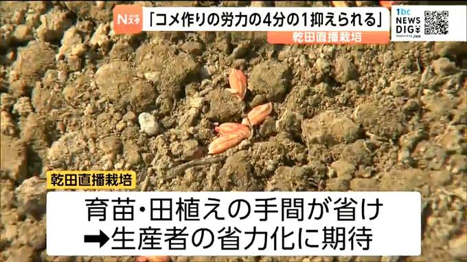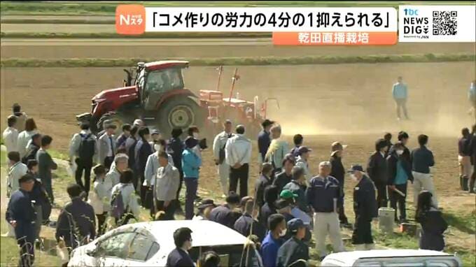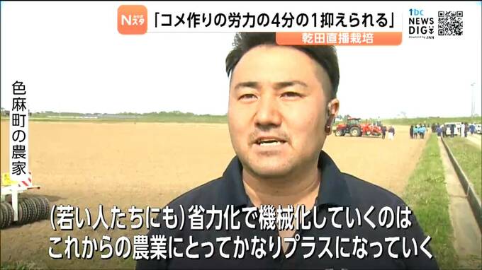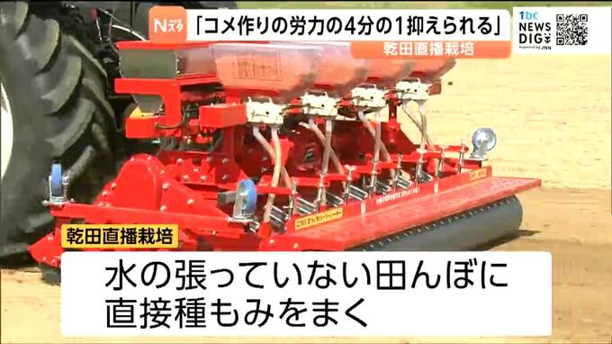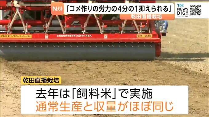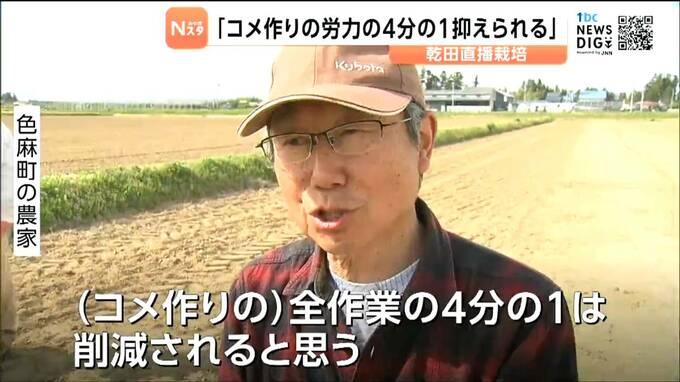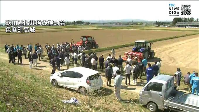 田んぼに直接種もみを撒き、田植えの手間を省くことができる乾田直播(かんでんちょくは)栽培の検討会が、宮城県色麻町で開かれ、参加した農家からは「コメ作りの労力が4分の1は抑えられる」との声が聞かれました。