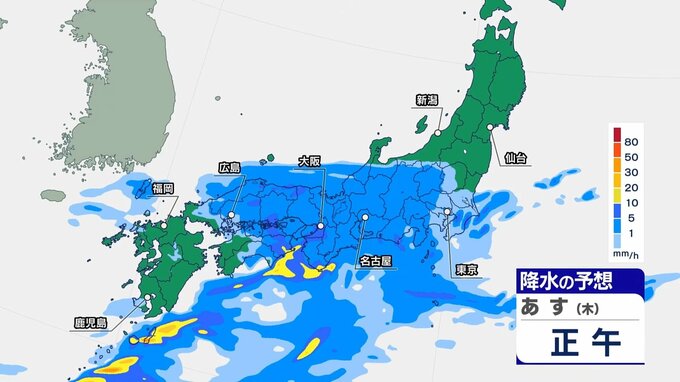 雨雲は次第に東に広がり、昼前からは関東でも雨が降り出してきそうです。日中は広い範囲で本降りの雨ですが、夕方以降は九州、中国、四国の雨はだんだんとやんでいく見込みです。