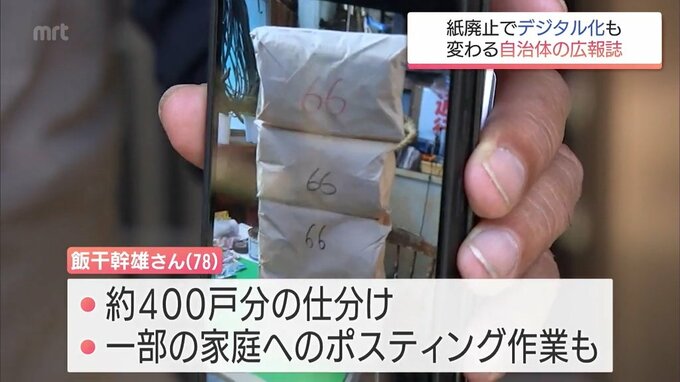 78歳で事務員をしている飯干幹雄さんは、これまでおよそ400戸分の広報誌の仕分けだけではなく、一部の家庭へのポスティング作業も担当していました。
