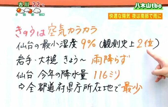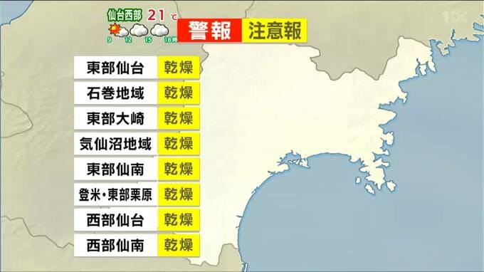 宮城県内全域に乾燥注意報が発表されています。火の取り扱いに十分な注意が必要です。