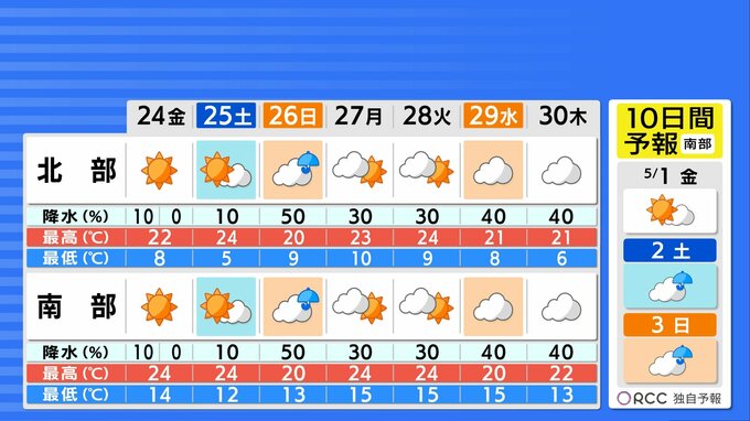 ゴールデンウィーク前半は、晴れ間の広がる日が多いでしょう。日曜日は雨が降り、来週水曜日・木曜日もすっきりせず、雨が降る可能性があります。日中の気温は、晴れると20℃を大きく超えて、半袖日和になります。レジャーの際は暑さ対策も必要になるでしょう。