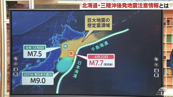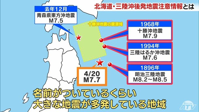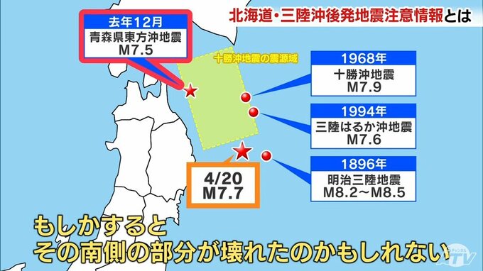 「(三陸沖は)地震の多発地帯です。今回の震源のすぐそばでは、1994年に『三陸はるか沖地震』がありました。さらに1968年の『十勝沖地震』、1896年の『明治三陸地震』など、名前のついた大きな地震が多発している地域でもあります。」