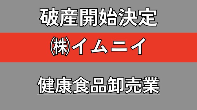 【倒産】健康食品の多様化・競争激化で売り上げ低迷 2007年に年商約2億円を計上していた「健康食品・サプリメントの卸売業者」が破産開始決定【東京商工リサーチ】 RSK山陽放送 2026年4月23日(木) 11:20 国内 民間の信用調査会社「東京商工リサーチ岡山支店」によりますと、(株)イムニイ(備前市伊部)が、4月15日に岡山地裁から破産開始決定を受けたということです。 【画像】