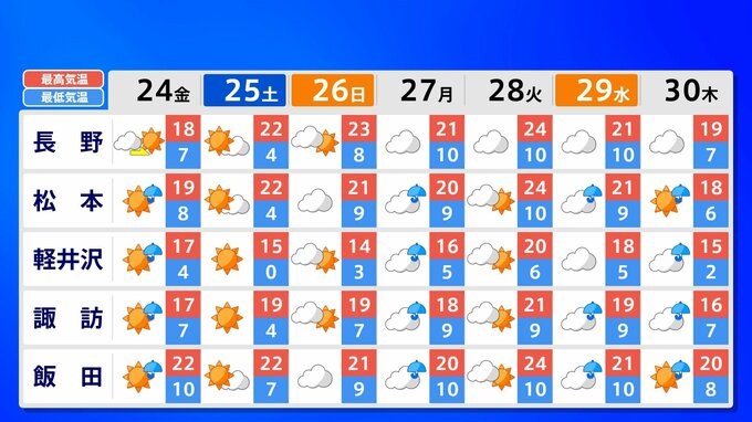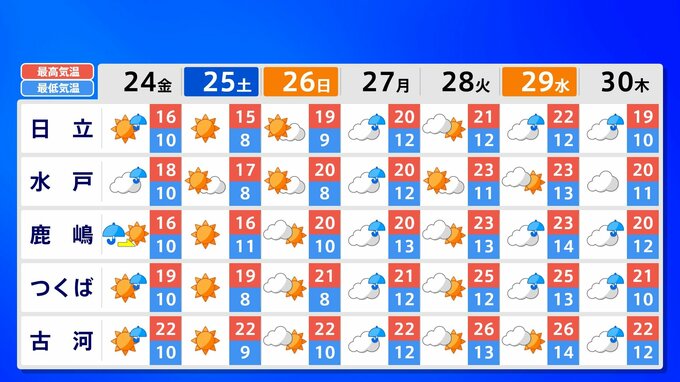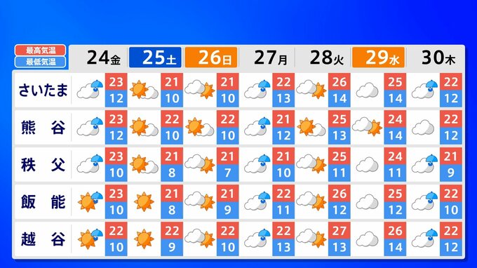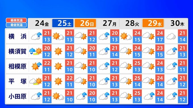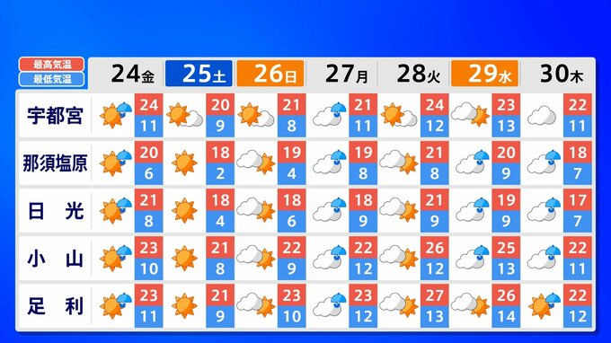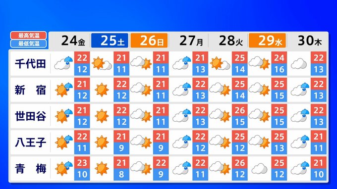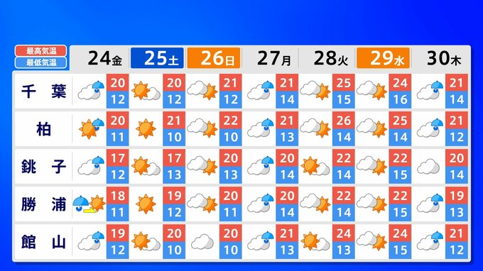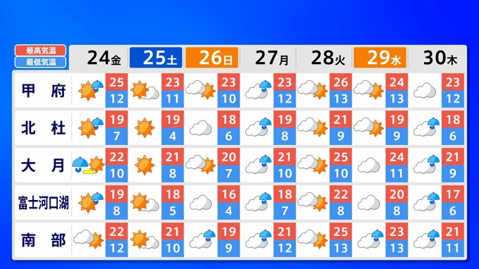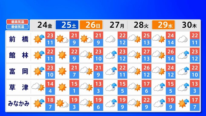 関東甲信地方 各都市の週間予報(24日(金)~30日(木))
