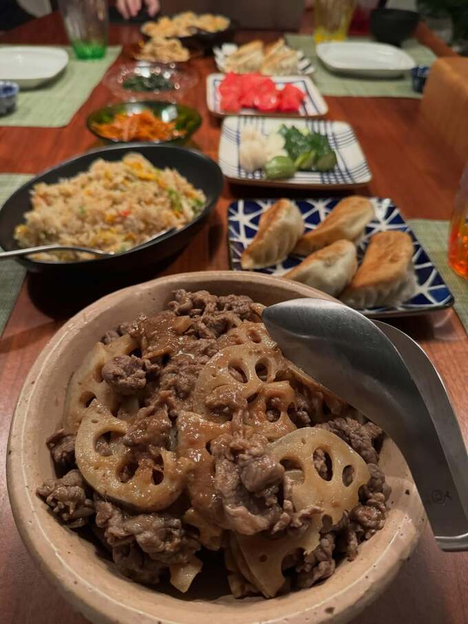 メイン料理は牛肉とレンコンを梅干しと鰹節で炒めた一品。投稿された写真には、土鍋風の器に盛られた牛肉とレンコンの炒め物を中心に、チャーハンや餃子など、多彩な料理がテーブルいっぱいに並ぶ様子が写っています。
