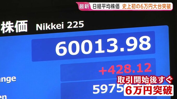 きょうの東京株式市場で日経平均株価は史上初めて6万円の大台を突破しました。中継です。中東情勢の先行きが混沌とするその裏で、日経平均株価は着実に上昇を続け、ついに歴史的な瞬間を迎えました。記者「日経平…