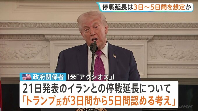 アメリカとイランの停戦の延長をめぐり、トランプ大統領は「3日間から5日間」を想定していると報じられました。一方、ホワイトハウスは期限を設けていないと、これを否定しています。トランプ大統領が21日に発表し…