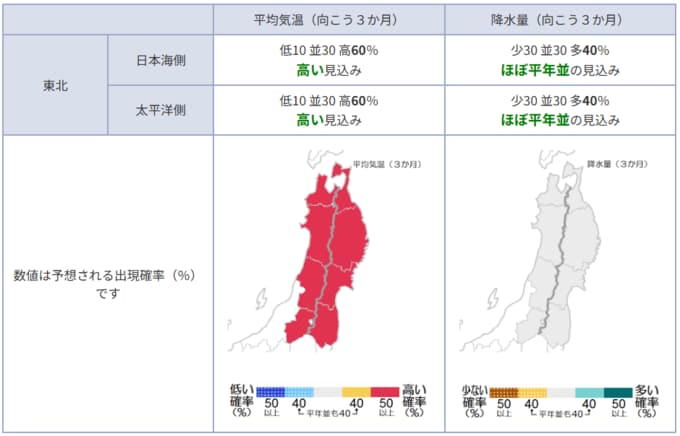 東北日本海側:ほぼ平年並の見込み 東北太平洋側:ほぼ平年並の見込み