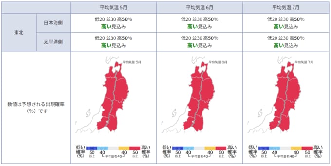 東北日本海側:高い見込み 東北太平洋側:高い見込み
