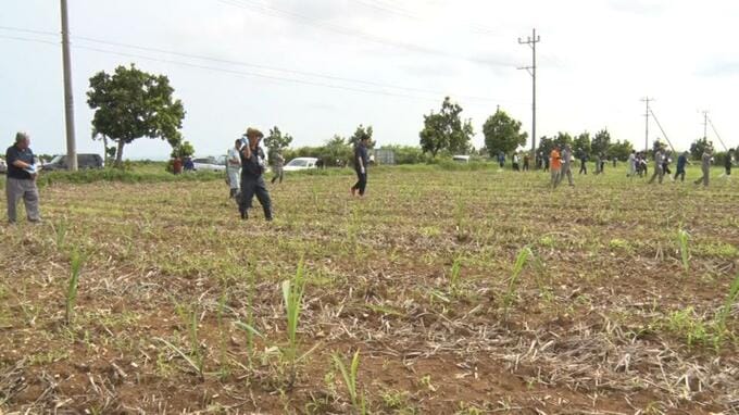 この日、宮古島市城辺友利地区の圃場には、生産者や製糖工場の関係者など50人あまりが参加しました。