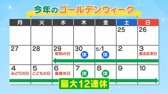 まもなく始まるゴールデンウィーク。カレンダーを見てみると、まず、多くの人が休みとなるのは、5月2日から6日の5連休です。4月30日と5月1日に休みを取った場合、29日の昭和の日から5月6日までの8連休になります。さらに、7日と8日を休みとした場合は、4月29日から5月6日までの最大12連休になるんです。
