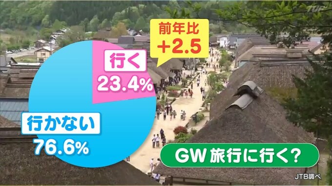 大手旅行会社JTBの調査によりますと、今年、国内外で旅行に行くと回答した人は23.4%と、前の年と比べて2.5ポイント増加し、7割余りの人は旅行に行かないと回答しています。