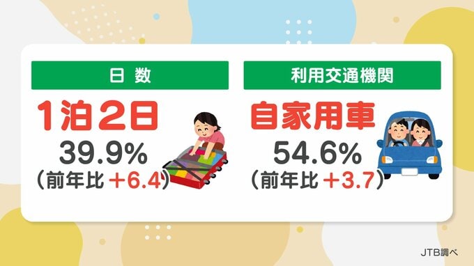 注目の旅行日数ですが、最も多かったのは1泊2日です。およそ4割の人がこの日数を選択していて、前の年と比べて6.4ポイント増えたということです。また、利用交通機関は半数以上の54.6%(前年比+3.7ポイント)が自家用車を使うという結果になりました。