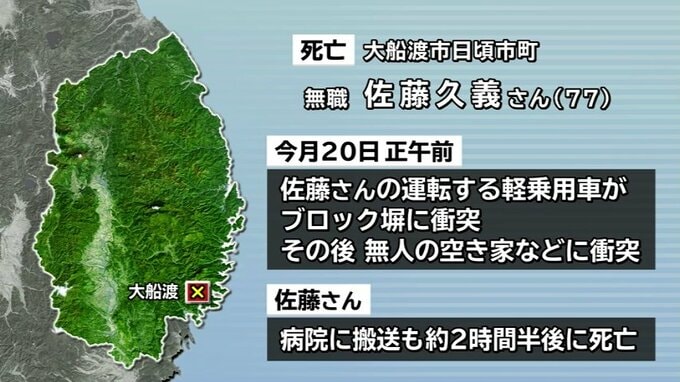 岩手県大船渡市で20日、軽自動車がブロック塀や空き家にぶつかり、運転していた77歳の男性が死亡しました。亡くなったのは大船渡市日頃市町の無職・佐藤久義さん(77)です。警察によりますと20日の正午前、佐藤さ…