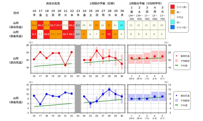 ・最近1週間の実況と今後2週間先までの気温の推移を表示しています。