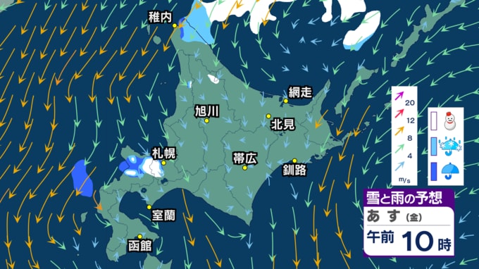 あすの道内は、午前中は道北や道央の所々で雨が降り、山沿いでは雪が降ることもありそうです。