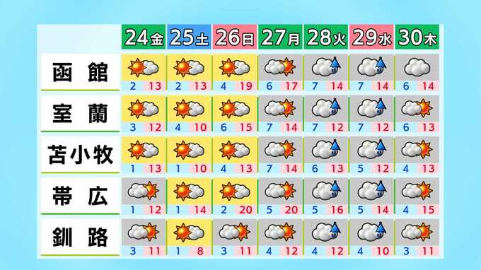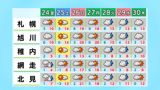 ただし、日曜日には寒気が抜け札幌や旭川などでは20℃くらいまで気温が上がり、初夏のような陽気になりそうです。
