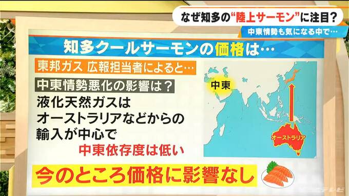 東邦ガスの広報担当者によると、「液化天然ガスは、オーストラリアなどからの輸入が中心で中東依存度は低い」とのことです。リスクヘッジのために中東依存を下げてるそうです。あらかじめ、中東ではなくオーストラリアなどから液化天然ガスを輸入しているので、直接的なガス料金や知多クールサーモンへの影響は、今のところはないということです。
