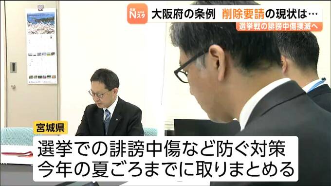 選挙運動での誹謗中傷などの対策を話し合う検討会議が、宮城県庁で開かれ先行事例として、大阪府の条例が紹介されました。