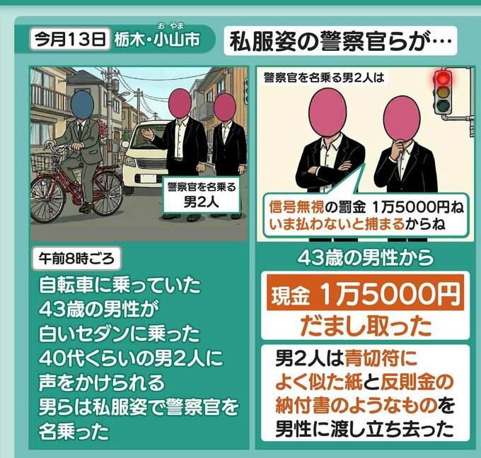 70代男性が自転車に乗っていたところ、警察官を名乗る男2人に声をかけられ「手信号をしないのは違反。この場で違反金を支払わないといけない。警察官2名だから、2万5千円ずつ支払え」などと言われ、反則金名目で現金5万円をだまし取られました。