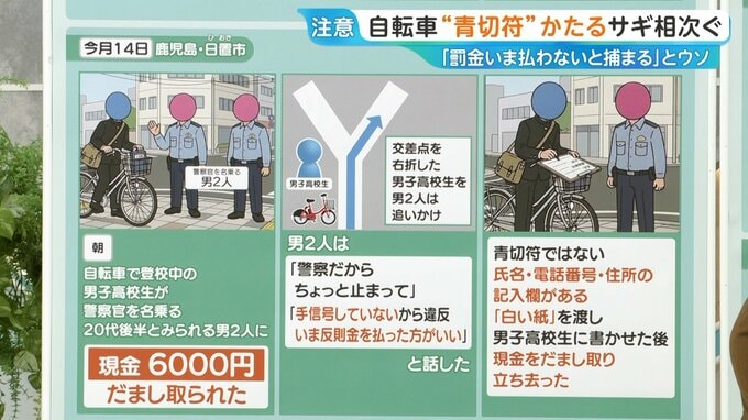 青切符ではなく、氏名・電話番号・住所の記入欄がある白い紙を渡し男子高校生に書かせた後、現金6000円をだまし取り、立ち去りました。