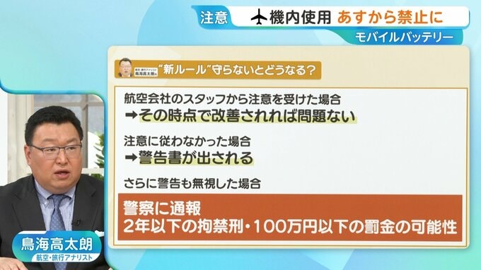 航空機の中でのモバイルバッテリーの使用禁止。