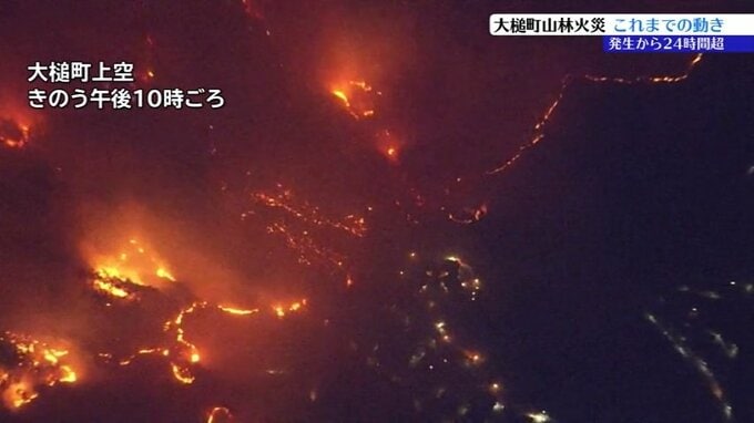 「大槌町吉里吉里の上空です。夜になっても火の勢いはおさまらず、住宅にも近づいています」
