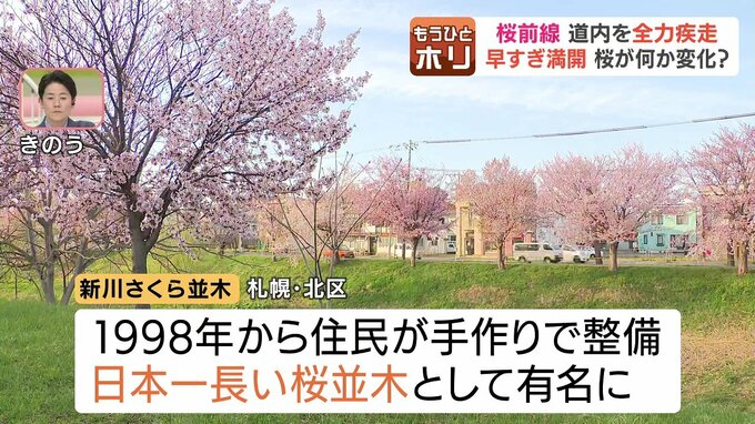 札幌市北区の「新川さくら並木」です。人工の河川で、緑が少ない新川に彩りを添えようと、28年前から地元の住民らが手作りで整備しました。