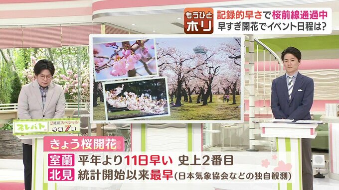 やっぱり手がかかるというところもあります。ただ、そんな中で今日も開花の便りです。室蘭でソメイヨシノの開花が発表されました。はい、平年より11日早い、観測史上2番目に早い記録です。そして、北見でもエゾヤマザクラの開花が、日本気象協会と地元商工会の独自観測で発表されました。こちらは2010年の統計開始以来、最も早い開花ということです。