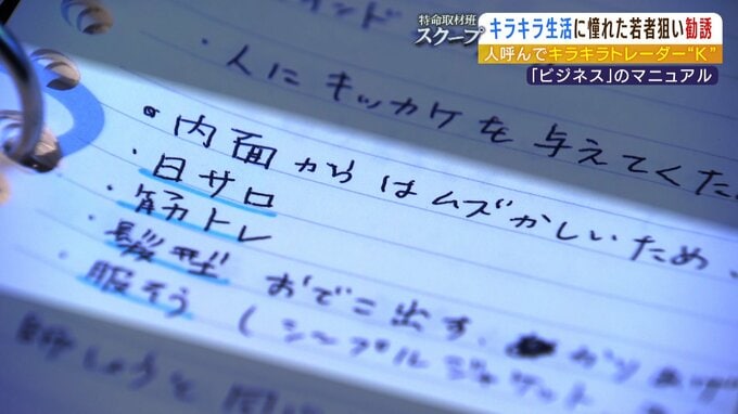 そのマニュアルでは「内面からは難しいため、まずは外見を変えろ」と日サロに筋トレ、髪型はデコ出しを推奨。自分を格上に見せるためのトークテクニックなど勧誘のノウハウが詳細に書かれている。
